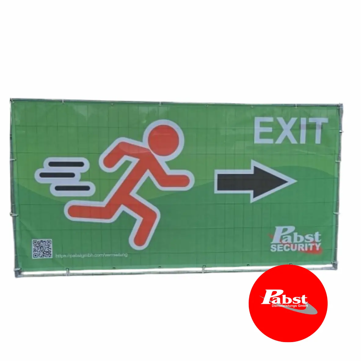 Das Notausgangsbanner mit Pabst Brand (Pfeil rechts) dient der eindeutigen Kennzeichnung von Flucht- und Rettungswegen bei Veranstaltungen. Die klare Pfeilrichtung nach rechts sorgt für eine unmissverständliche Besucherführung im Notfall.